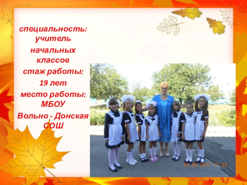 специальность: учитель начальных классовстаж работы:19 летместо работы: МБОУ Вольно - Донская СОШ