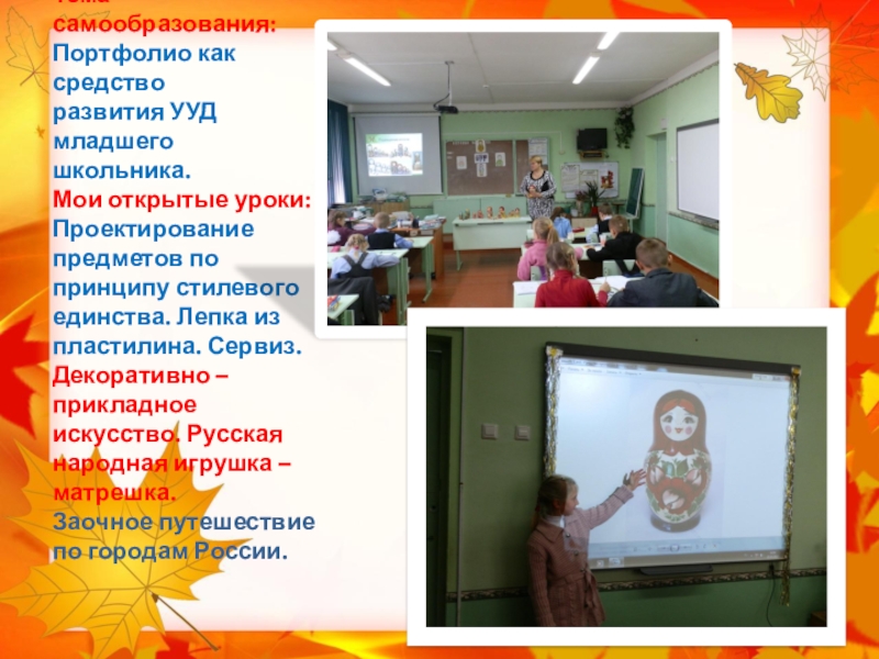 Слайд 9Тема самообразования: Портфолио как средство развития УУД младшего школьника. Мои открытые уроки: Проектирование предметов