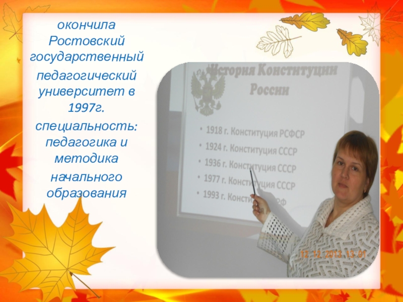 окончила Ростовский государственный педагогический университет в 1997г.специальность: педагогика и методика начального образования