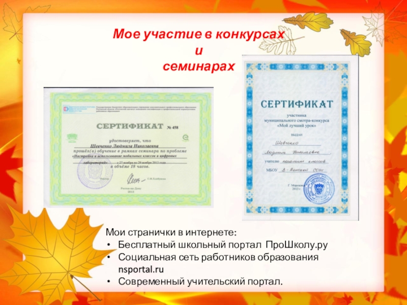 Мое участие в конкурсах  и  семинарахМои странички в интернете:Бесплатный школьный портал ПроШколу.руСоциальная сеть работников образования