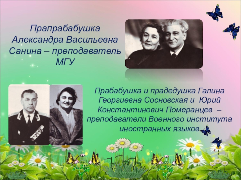 Прапрабабушка Александра Васильевна Санина – преподаватель МГУПрабабушка и прадедушка Галина Георгиевна Сосновская и Юрий Константинович Померанцев –