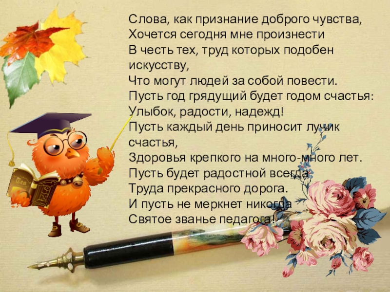 которых подобен искусству, Что могут людей за собой повести. Пусть год грядущий будет годом счастья: Улыбок, радости, надежд! Пусть каждый день приносит лучик счастья, Здоровья крепкого на много-много лет. Пусть будет радостной всегда Труда прекрасного дорога. И пусть не меркнет никогда Святое званье педагога!
