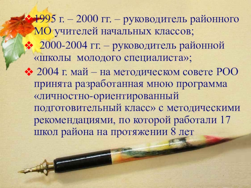 Слайд 71995 г. – 2000 гг. – руководитель районного МО учителей начальных