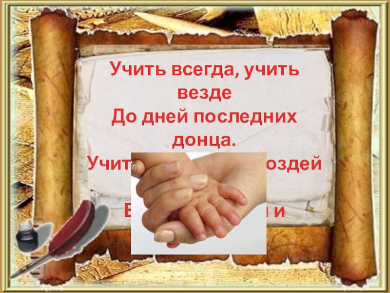 Учить всегда, учить вездеДо дней последних донца.Учить и никаких гвоздей –Вот лозунг мой и солнца!!!