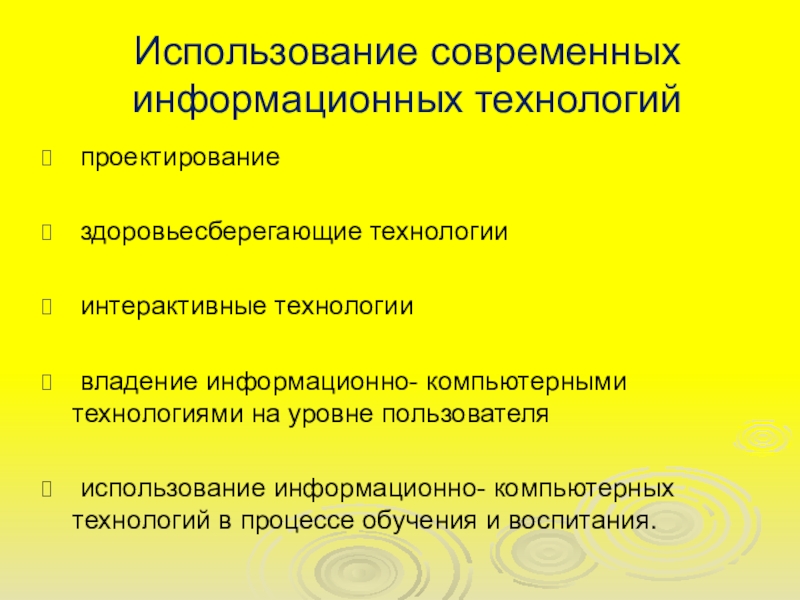 Использование современных информационных технологий проектирование здоровьесберегающие технологии интерактивные технологии владение информационно- компьютерными технологиями на уровне пользователя использование