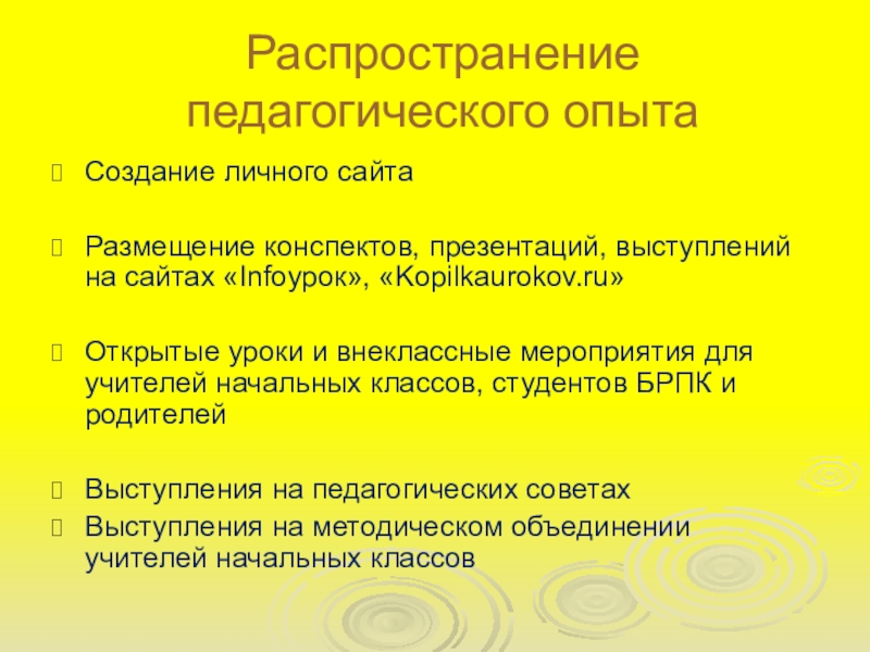 Распространение педагогического опытаСоздание личного сайтаРазмещение конспектов, презентаций, выступлений на сайтах «Infoурок», «Kopilkaurokov.ru»Открытые уроки и внеклассные мероприятия для