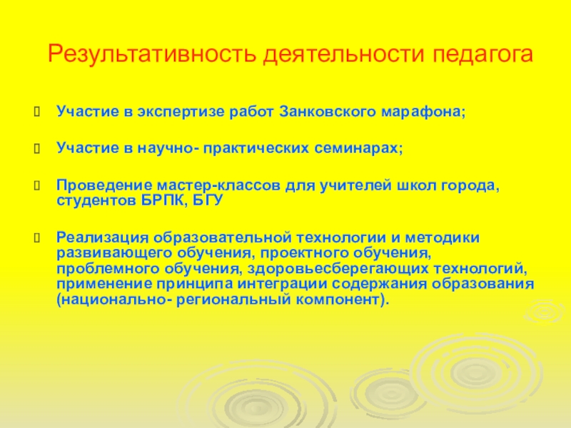 Результативность деятельности педагогаУчастие в экспертизе работ Занковского марафона;Участие в научно- практических семинарах;Проведение мастер-классов для учителей школ города,