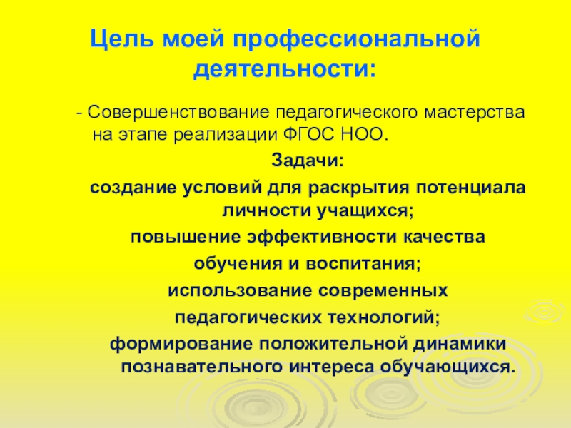 Цель моей профессиональной деятельности: - Совершенствование педагогического мастерства на этапе реализации ФГОС НОО.Задачи:создание условий для раскрытия потенциала личности учащихся;повышение эффективности качества обучения и воспитания;использование современных педагогических технологий;формирование положительной динамики познавательного интереса обучающихся.