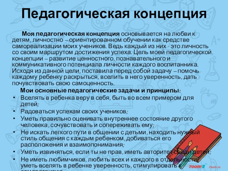 к детям, личностно – ориентированном обучении как средстве самореализации моих учеников. Ведь каждый из них - это личность со своим маршрутом достижения успеха. Цель моей педагогической концепции – развитие ценностного, познавательного и коммуникативного потенциала личности каждого воспитанника. Исходя из данной цели, поставила перед собой задачу – помочь каждому ребенку раскрыться, вселить в него уверенность, дать почувствовать свою самоценность.