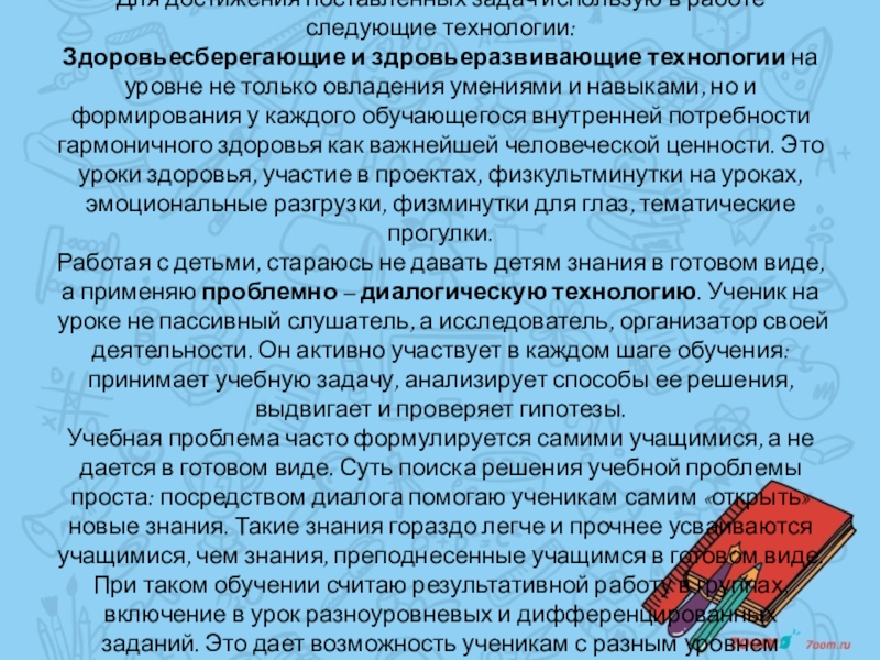 Работая с детьми, стараюсь не давать детям знания в готовом виде, а применяю проблемно – диалогическую технологию. Ученик на уроке не пассивный слушатель, а исследователь, организатор своей деятельности. Он активно участвует в каждом шаге обучения: принимает учебную задачу, анализирует способы ее решения, выдвигает и проверяет гипотезы.