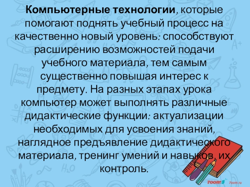 способствуют расширению возможностей подачи учебного материала, тем самым существенно повышая интерес к предмету. На разных этапах урока компьютер может выполнять различные дидактические функции: актуализации необходимых для усвоения знаний, наглядное предъявление дидактического материала, тренинг умений и навыков, их контроль.