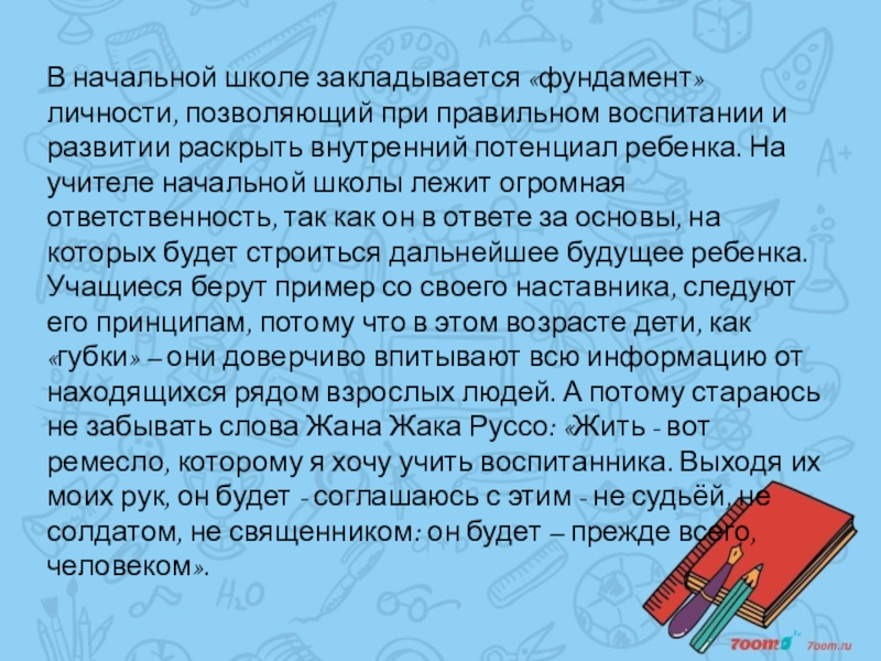 развитии раскрыть внутренний потенциал ребенка. На учителе начальной школы лежит огромная ответственность, так как он в ответе за основы, на которых будет строиться дальнейшее будущее ребенка. Учащиеся берут пример со своего наставника, следуют его принципам, потому что в этом возрасте дети, как «губки» – они доверчиво впитывают всю информацию от находящихся рядом взрослых людей. А потому стараюсь не забывать слова Жана Жака Руссо: «Жить - вот ремесло, которому я хочу учить воспитанника. Выходя их моих рук, он будет - соглашаюсь с этим - не судьёй, не солдатом, не священником: он будет – прежде всего, человеком».