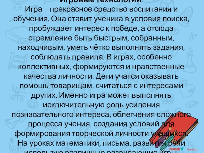 ученика в условия поиска, пробуждает интерес к победе, а отсюда стремление быть быстрым, собранным, находчивым, уметь чётко выполнять задания, соблюдать правила. В играх, особенно коллективных, формируются и нравственные качества личности. Дети учатся оказывать помощь товарищам, считаться с интересами других. Именно игра может выполнять исключительную роль усиления познавательного интереса, облегчения сложного процесса учения, создания условий для формирования творческой личности учащихся. На уроках математики, письма, развития речи использую различные развивающие игры.