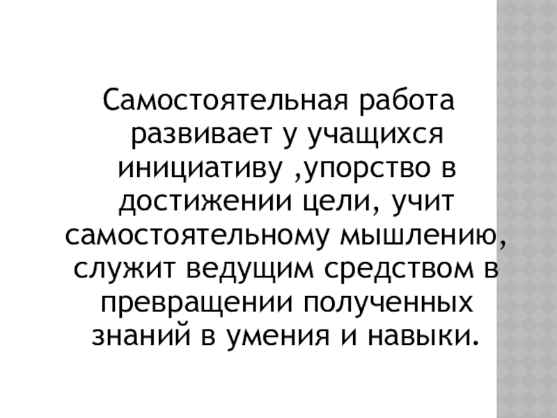Самостоятельная работа развивает у учащихся инициативу ,упорство в достижении цели, учит