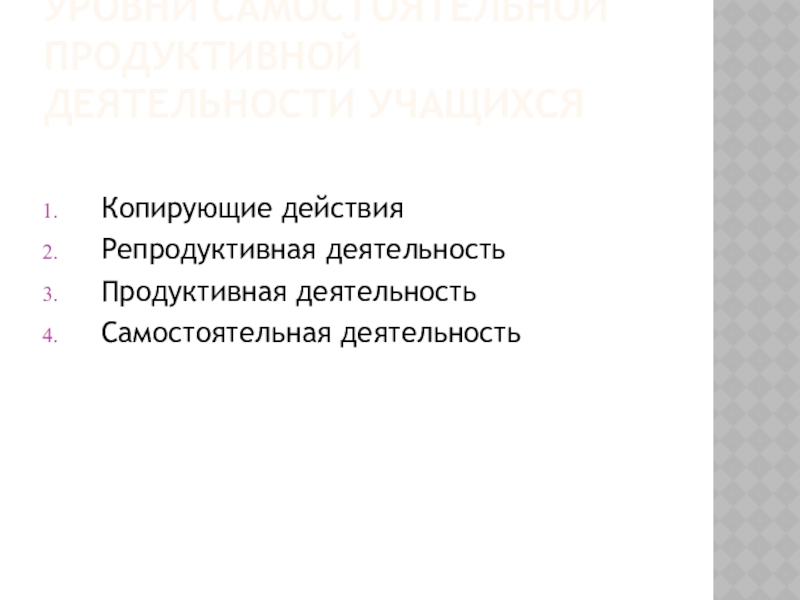 Слайд 5УРОВНИ САМОСТОЯТЕЛЬНОЙ ПРОДУКТИВНОЙ ДЕЯТЕЛЬНОСТИ УЧАЩИХСЯ
