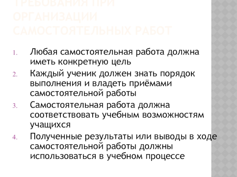 Слайд 6ТРЕБОВАНИЯ ПРИ ОРГАНИЗАЦИИ САМОСТОЯТЕЛЬНЫХ РАБОТ