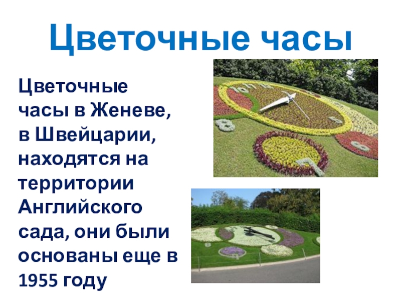 Цветочные часыЦветочные часы в Женеве, в Швейцарии, находятся на территории Английского сада, они были основаны еще в