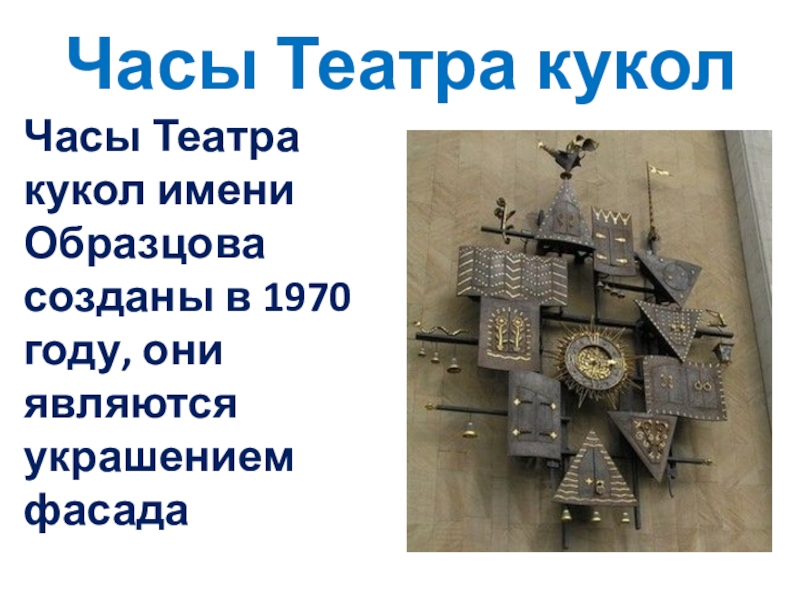 Часы Театра кукол Часы Театра кукол имени Образцова созданы в 1970 году, они являются украшением фасада