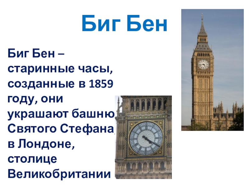 Биг БенБиг Бен – старинные часы, созданные в 1859 году, они украшают башню Святого Стефана, в Лондоне, столице Великобритании