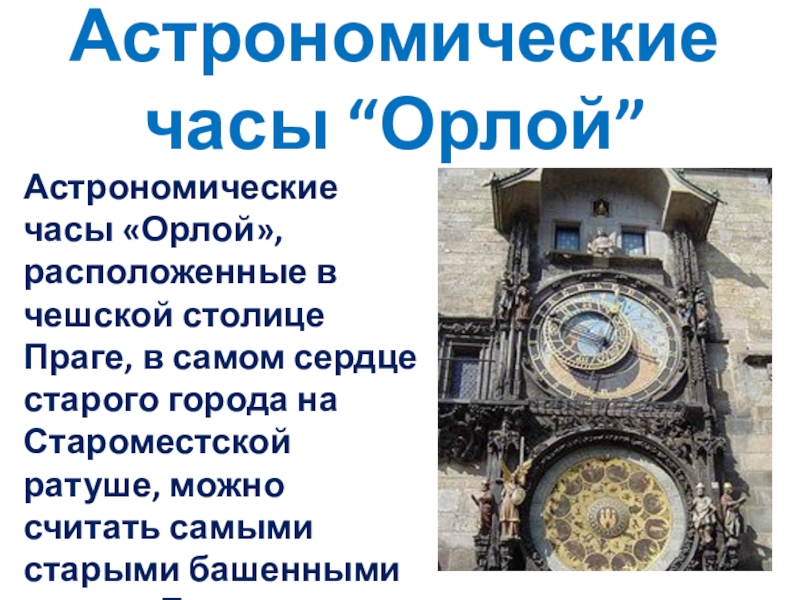 Астрономические часы “Орлой” Астрономические часы «Орлой», расположенные в чешской столице Праге, в самом сердце старого города на