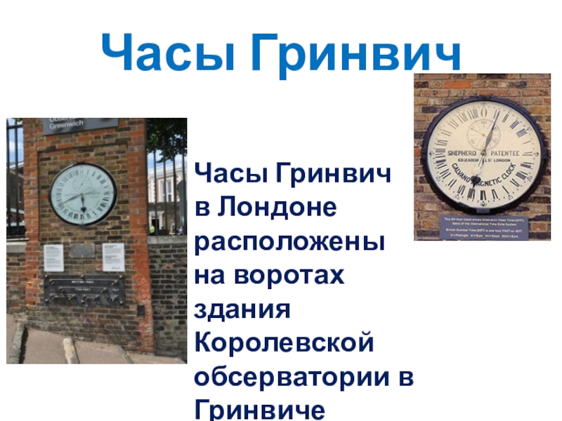 Часы ГринвичЧасы Гринвич в Лондоне расположены на воротах здания Королевской обсерватории в Гринвиче