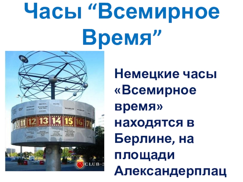 Часы “Всемирное Время”  Немецкие часы «Всемирное время» находятся в Берлине, на площади Александерплац