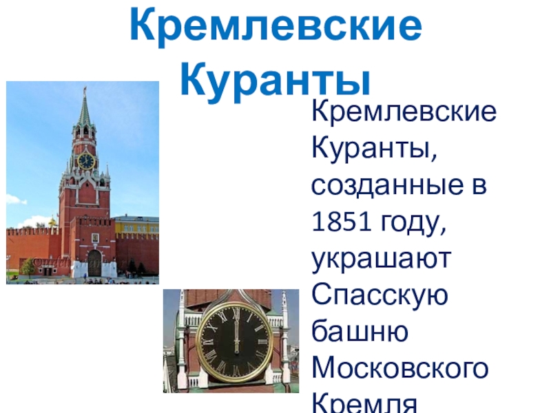 Кремлевские КурантыКремлевские Куранты, созданные в 1851 году, украшают Спасскую башню Московского Кремля