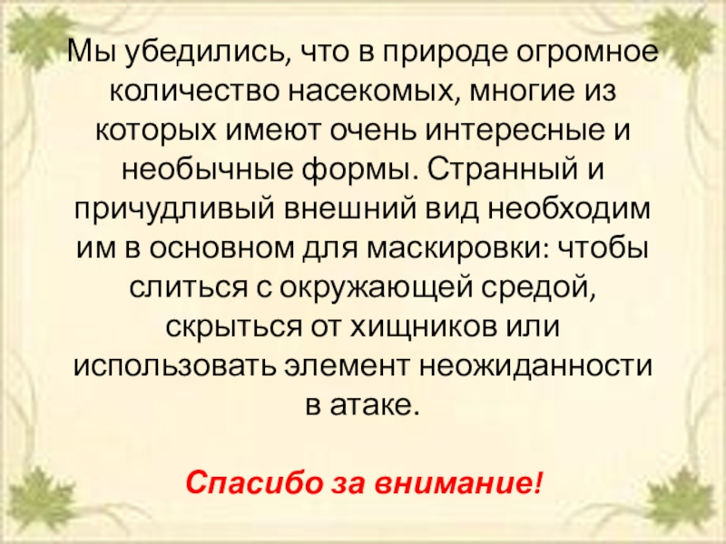 имеют очень интересные и необычные формы. Странный и причудливый внешний вид необходим им в основном для маскировки: чтобы слиться с окружающей средой, скрыться от хищников или использовать элемент неожиданности в атаке. Спасибо за внимание!