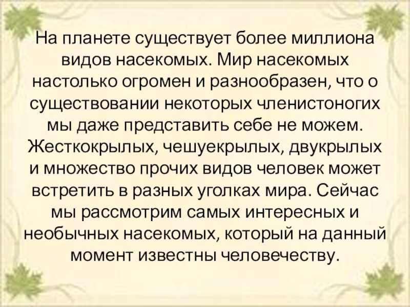 Слайд 2На планете существует более миллиона видов насекомых. Мир насекомых настолько огромен