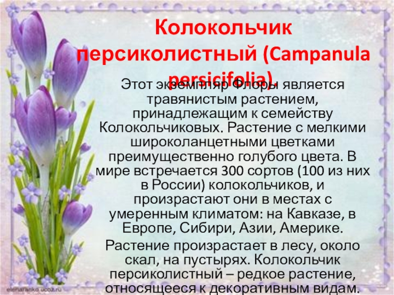 семейству Колокольчиковых. Растение с мелкими широколанцетными цветками преимущественно голубого цвета. В мире встречается 300 сортов (100 из них в России) колокольчиков, и произрастают они в местах с умеренным климатом: на Кавказе, в Европе, Сибири, Азии, Америке.