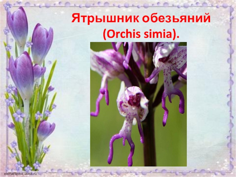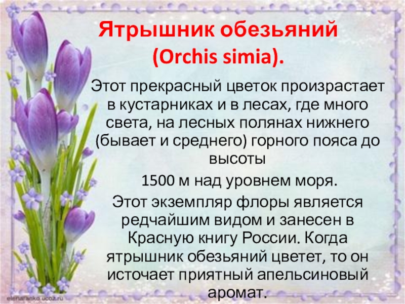Этот экземпляр флоры является редчайшим видом и занесен в Красную книгу России. Когда ятрышник обезьяний цветет, то он источает приятный апельсиновый аромат.