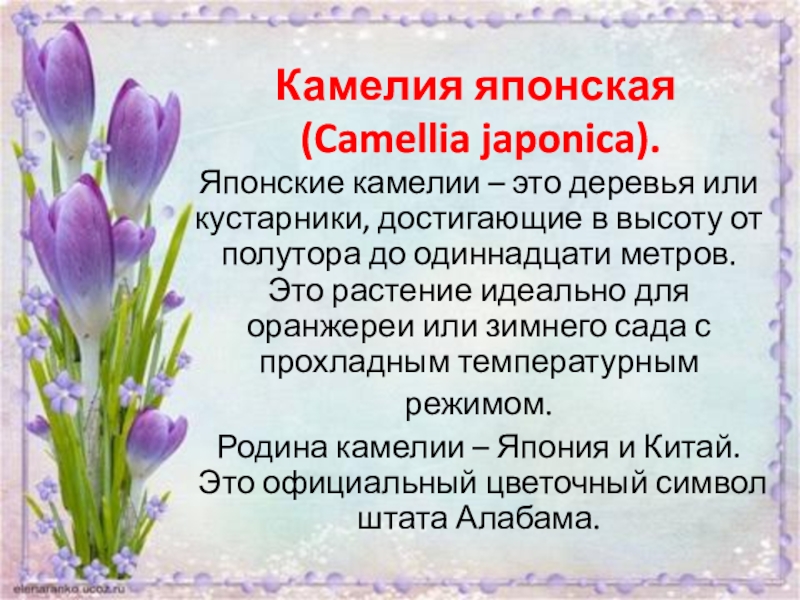 Родина камелии – Япония и Китай. Это официальный цветочный символ штата Алабама.