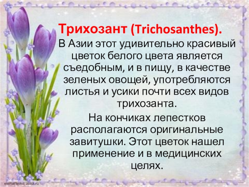 и в пищу, в качестве зеленых овощей, употребляются листья и усики почти всех видов трихозанта.