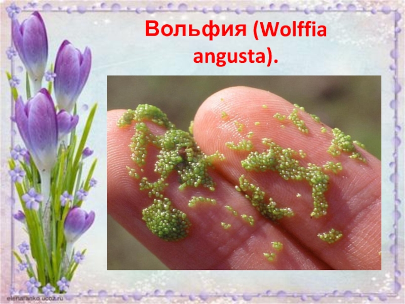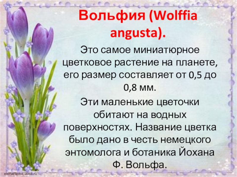 Эти маленькие цветочки обитают на водных поверхностях. Название цветка было дано в честь немецкого энтомолога и ботаника Йохана Ф. Вольфа.