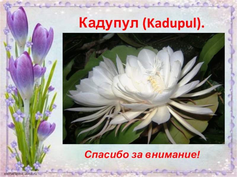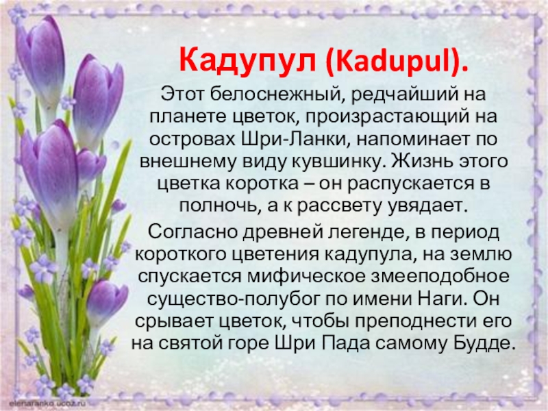 Согласно древней легенде, в период короткого цветения кадупула, на землю спускается мифическое змееподобное существо-полубог по имени Наги. Он срывает цветок, чтобы преподнести его на святой горе Шри Пада самому Будде.