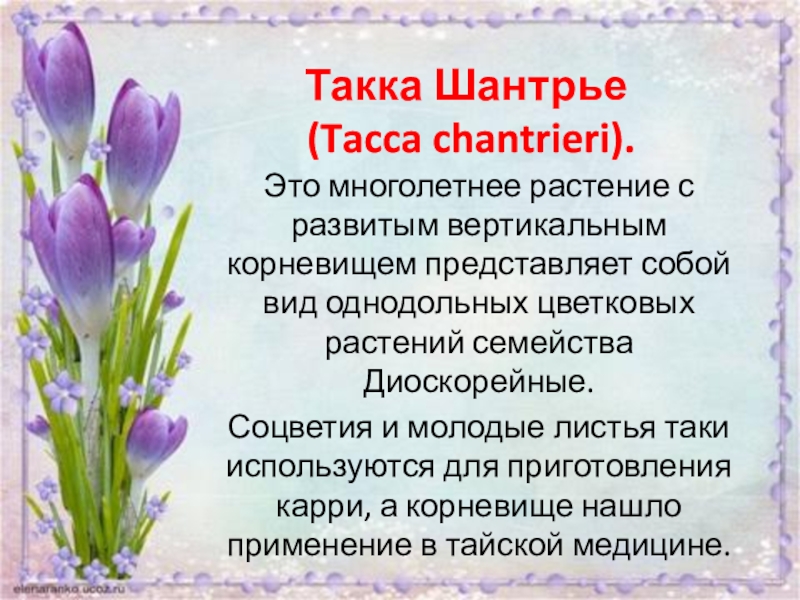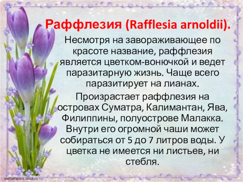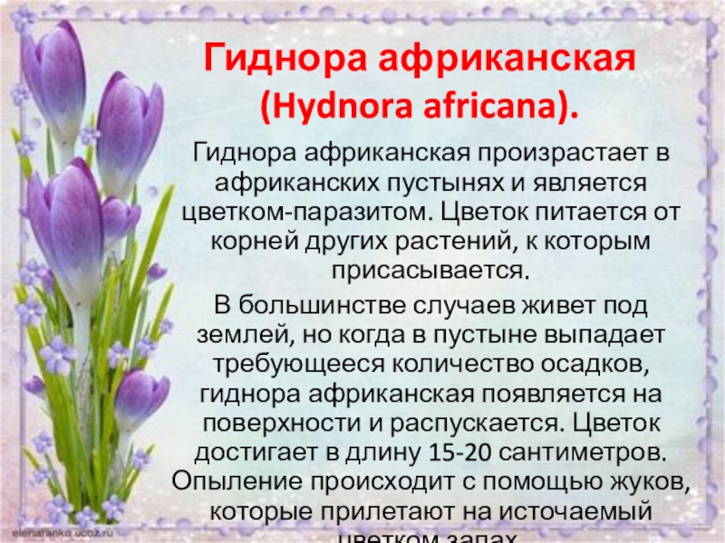 цветком-паразитом. Цветок питается от корней других растений, к которым присасывается.