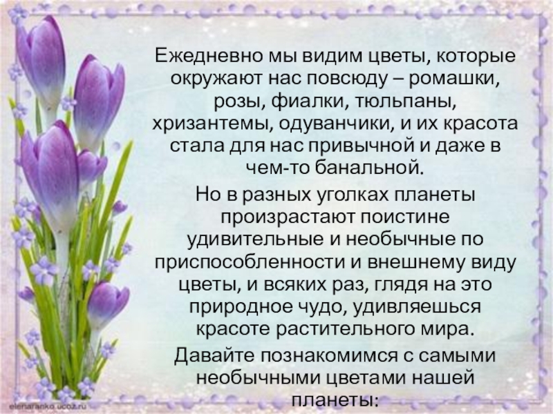 фиалки, тюльпаны, хризантемы, одуванчики, и их красота стала для нас привычной и даже в чем-то банальной.