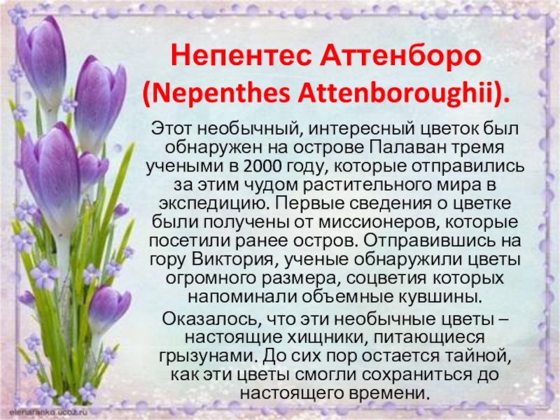 Оказалось, что эти необычные цветы – настоящие хищники, питающиеся грызунами. До сих пор остается тайной, как эти цветы смогли сохраниться до настоящего времени.