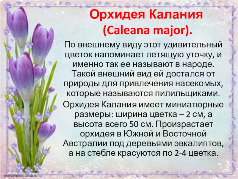 Орхидея Калания имеет миниатюрные размеры: ширина цветка – 2 см, а высота всего 50 см. Произрастает орхидея в Южной и Восточной Австралии под деревьями эвкалиптов, а на стебле красуются по 2-4 цветка.