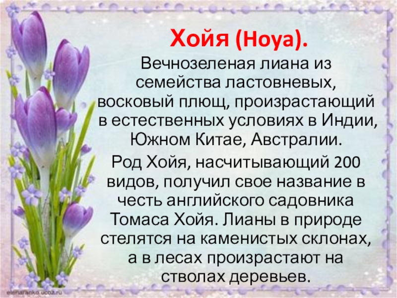 Род Хойя, насчитывающий 200 видов, получил свое название в честь английского садовника Томаса Хойя. Лианы в природе стелятся на каменистых склонах, а в лесах произрастают на стволах деревьев.