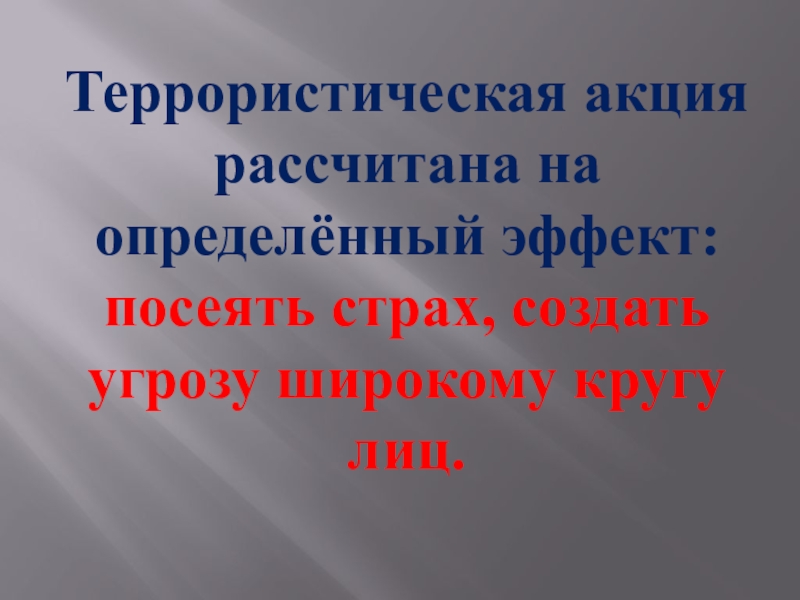 Слайд 4Террористическая акция рассчитана на определённый эффект: посеять страх, создать угрозу широкому