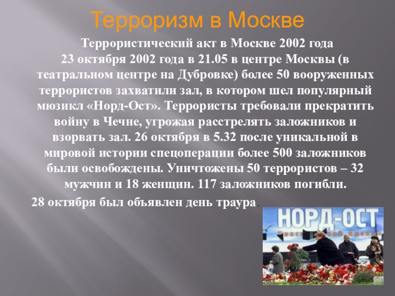 в 21.05 в центре Москвы (в театральном центре на Дубровке) более 50 вооруженных террористов захватили зал, в котором шел популярный мюзикл «Норд-Ост». Террористы требовали прекратить войну в Чечне, угрожая расстрелять заложников и взорвать зал. 26 октября в 5.32 после уникальной в мировой истории спецоперации более 500 заложников были освобождены. Уничтожены 50 террористов – 32 мужчин и 18 женщин. 117 заложников погибли.