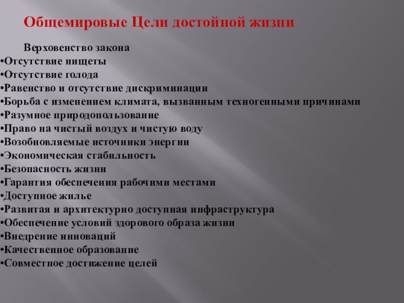 Общемировые Цели достойной жизни Верховенство закона Отсутствие нищеты Отсутствие голода Равенство и отсутствие дискриминации Борьба с изменением климата, вызванным техногенными причинами Разумное природопользование Право на чистый воздух и чистую водуВозобновляемые источники энергии Экономическая стабильностьБезопасность жизни Гарантия