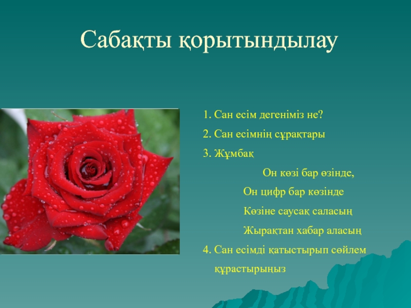 Сабақты қорытындылау12341. Сан есім дегеніміз не?2. Сан есімнің сұрақтары3. Жұмбақ