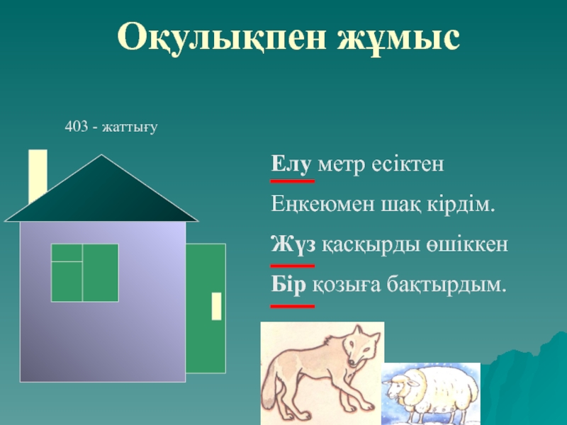 Оқулықпен жұмысЕлу метр есіктенЕңкеюмен шақ кірдім.Жүз қасқырды өшіккенБір қозыға бақтырдым.403 - жаттығу