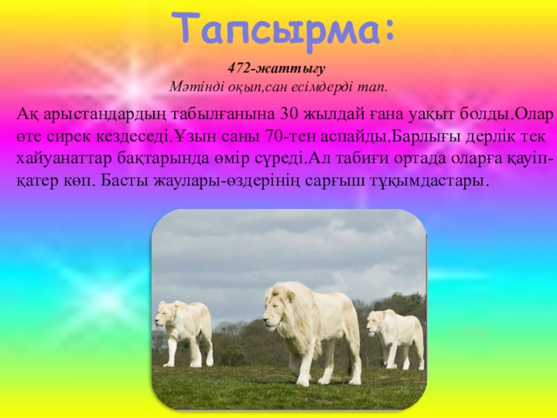 Ақ арыстандардың табылғанына 30 жылдай ғана уақыт болды.Олар өте сирек кездеседі.Ұзын саны 70-тен аспайды.Барлығы дерлік тек хайуанаттар бақтарында өмір сүреді.Ал табиғи ортада оларға қауіп-қатер көп. Басты жаулары-өздерінің сарғыш тұқымдастары.