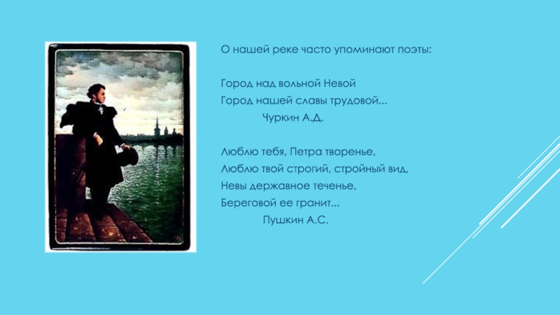 О нашей реке часто упоминают поэты:Город над вольной НевойГород нашей славы трудовой...		Чуркин А.Д.Люблю тебя, Петра творенье,Люблю твой