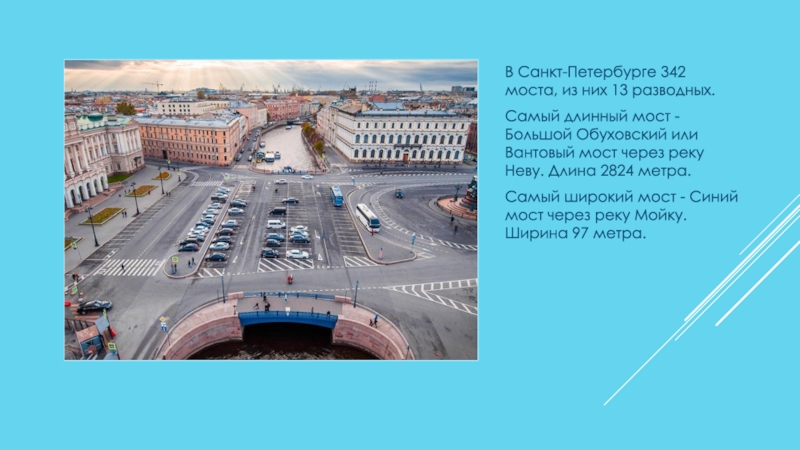 В Санкт-Петербурге 342 моста, из них 13 разводных.Самый длинный мост - Большой Обуховский или Вантовый мост через