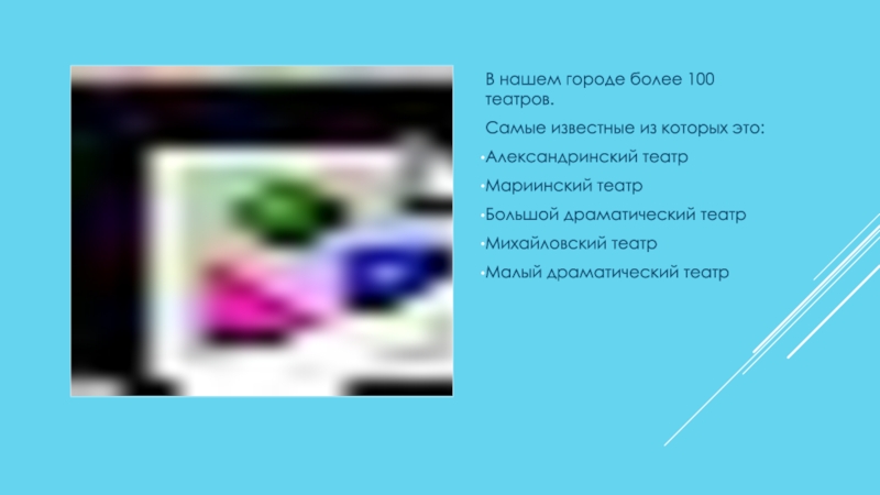 В нашем городе более 100 театров.Самые известные из которых это:Александринский театрМариинский театрБольшой драматический театрМихайловский театрМалый драматический театр