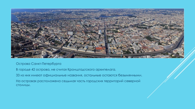 Острова Санкт-ПетербургаВ городе 42 острова, не считая Кронштадтского архипелага. 33 из них имеют официальные названия, остальные остаются